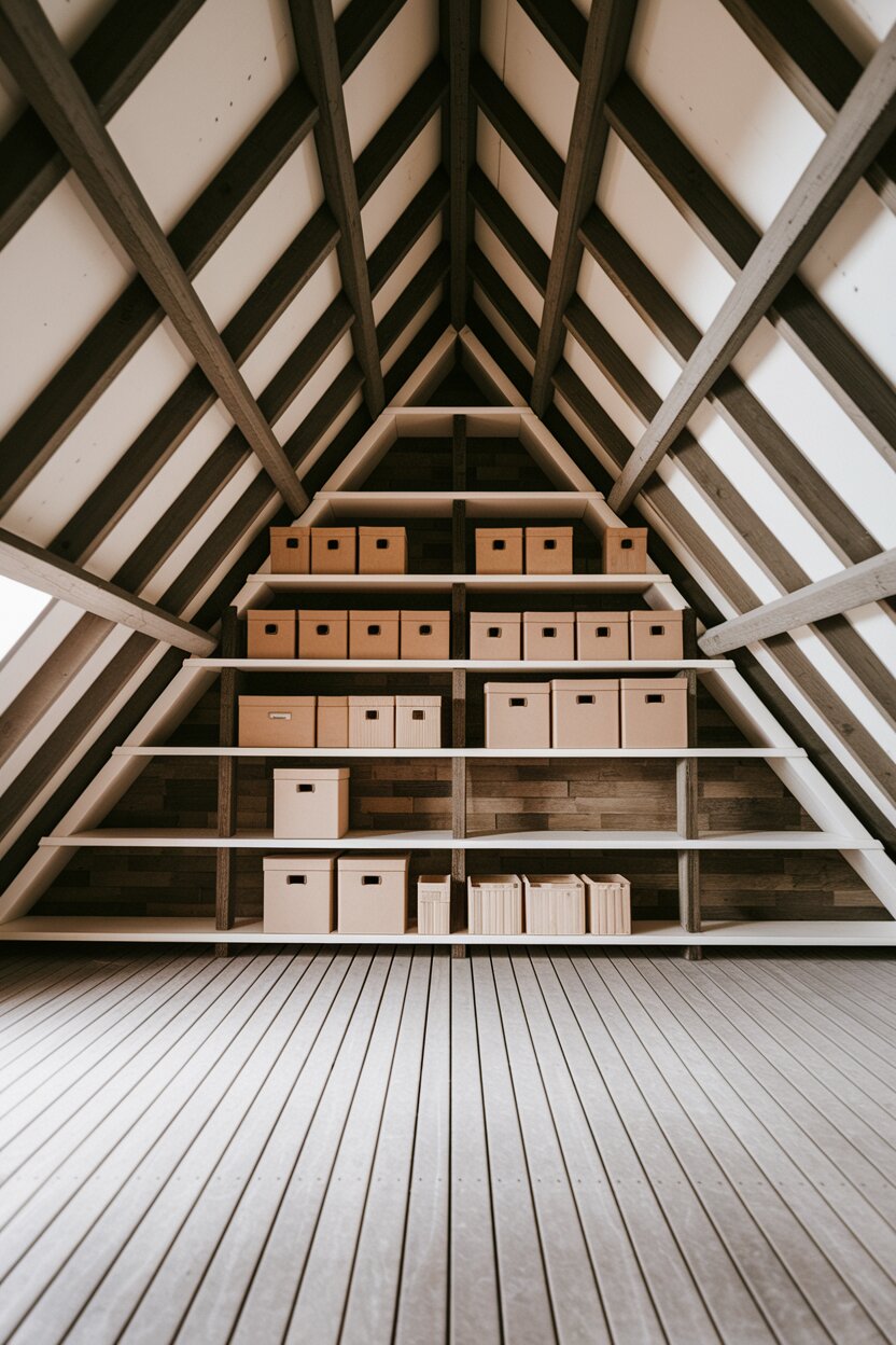 One of the most efficient ways to utilize vertical space in an unfinished attic is to build shelving directly between the wooden trusses or rafters. These structural beams often provide natural, evenly spaced framing that is perfect for securing shallow shelves without requiring bulky furniture. By mounting plywood or finished boards horizontally between the uprights, you create a “floating” storage system that keeps items off the floor and utilizes the dead space along the roofline.