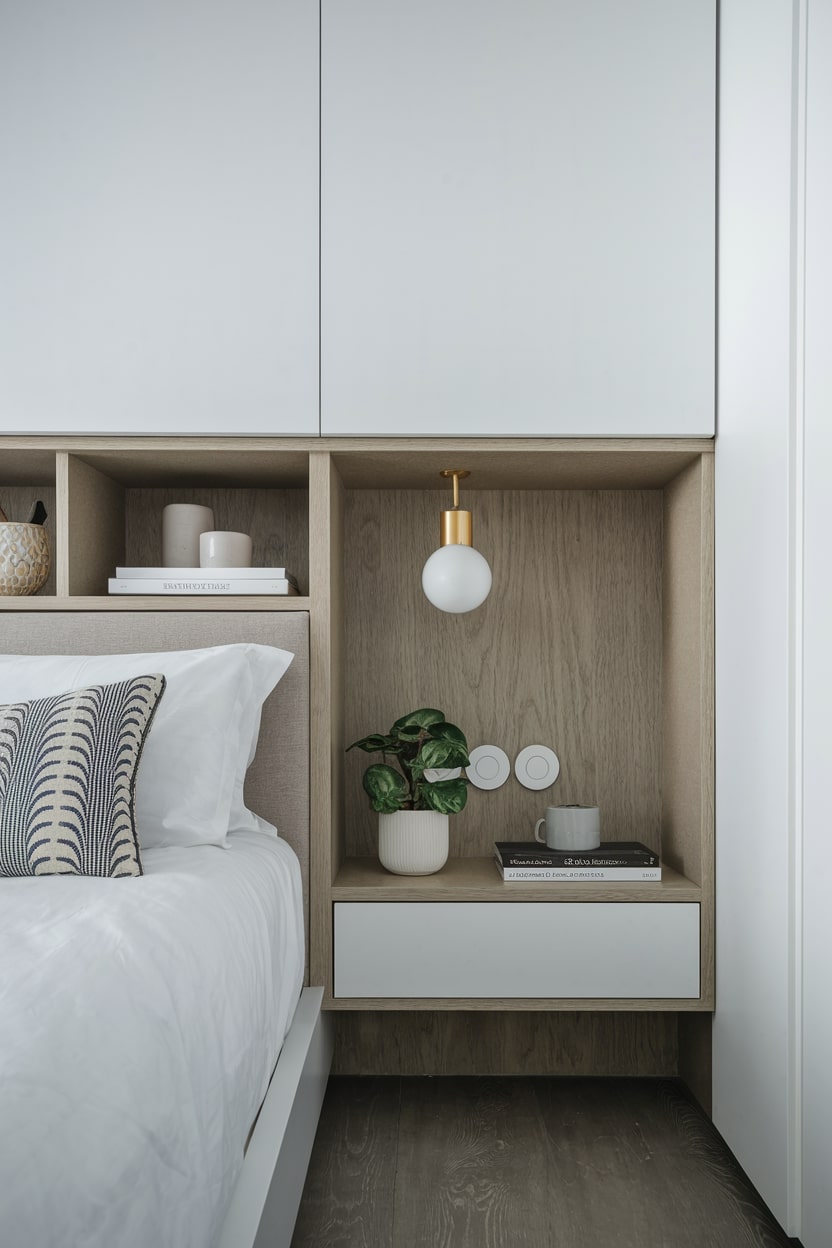 This type of headboard can effectively replace the need for separate nightstands, freeing up floor space and keeping your bedside essentials neatly organized and within arm’s reach. It’s an all-in-one solution that is perfect for compact living.