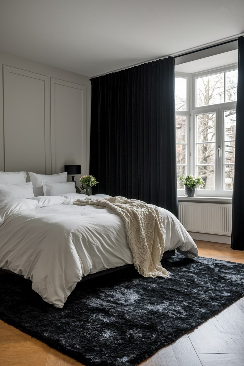 Enhance the comfort of your bedroom by focusing on plush textiles. A deep, soft black rug can feel incredibly luxurious underfoot, especially when contrasted with crisp white bedding. Consider adding heavy, light-blocking black curtains to create a cozy, den-like atmosphere conducive to restful sleep. These soft elements are crucial for making the room feel like a true sanctuary.