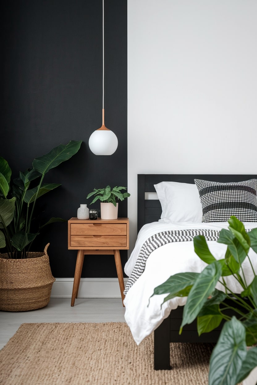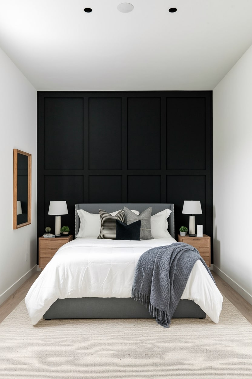 Creating a single black accent wall is a powerful way to add depth and drama without overwhelming the room. This technique anchors the space, often working best on the wall behind the headboard to create a natural focal point. To successfully execute this idea, paint one wall in a rich, matte black and keep the remaining walls and the ceiling a crisp, clean white. This contrast not only highlights your bed but also makes the white walls appear even brighter, enhancing the sense of space and light within the bedroom.