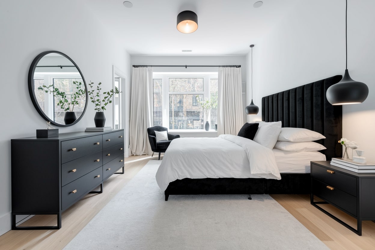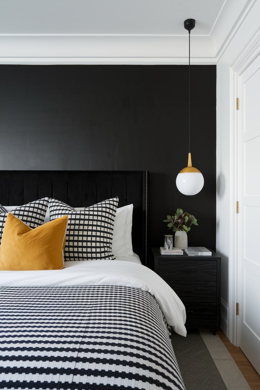 While the focus is on black and white, introducing a single, restrained pop of color can bring your bedroom design to life. A vibrant accent, such as a mustard yellow cushion, an emerald green vase, or a deep red book on the nightstand, can create a dynamic point of interest. The trick is to use this accent color sparingly — just one or two small items are enough to add personality without disrupting the serene and sophisticated black and white foundation.