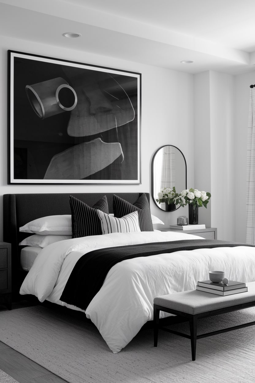 Elevate your bedroom with a large, compelling piece of black and white art. A single, oversized piece of abstract art or a striking black and white photograph can serve as the room’s centerpiece, drawing the eye and setting a sophisticated tone. Position this artwork above the bed or on the largest empty wall to give it the prominence it deserves. This approach adds a personal and artistic touch while maintaining the cohesive monochrome aesthetic.
