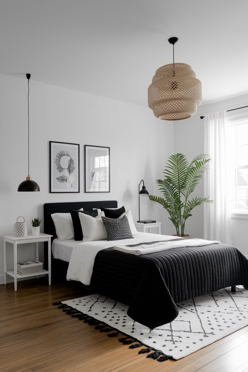 Soften the graphic nature of a black and white bedroom by introducing natural elements. The warmth of wood tones from a bed frame, nightstand, or flooring can provide a beautiful and organic contrast. Furthermore, adding houseplants introduces a touch of nature and life. The vibrant green of the foliage stands out beautifully against the monochrome background, purifying the air and adding a sense of tranquility to your personal retreat.