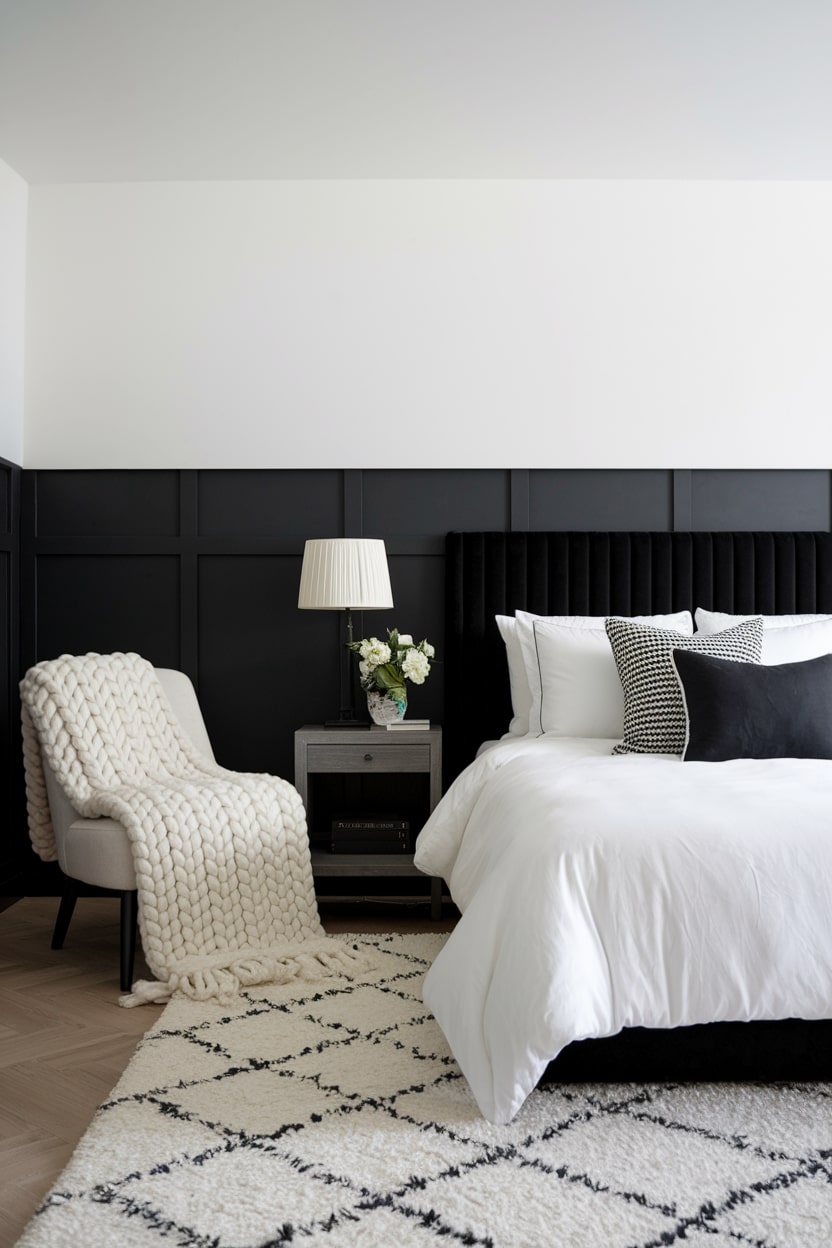 A black and white bedroom can risk feeling cold or sterile, but layering different textures is the perfect remedy. Combine a variety of materials to add warmth and visual interest. Think about a plush, high-pile white rug underfoot, a soft black velvet headboard, crisp white linen bedding, and perhaps a chunky knit throw blanket draped over a chair. These tactile elements invite touch and create a cozy, inviting atmosphere that softens the stark contrast of the color palette.