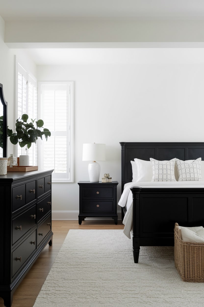 For a bold and grounded aesthetic, use black as the dominant color for your furniture. A black bed frame, dresser, and nightstands set against clean white walls create a powerful, sophisticated look. This approach allows the furniture’s silhouettes to truly stand out. To keep the room from feeling too heavy, ensure there is plenty of natural light and incorporate white accessories and textiles to provide balance.