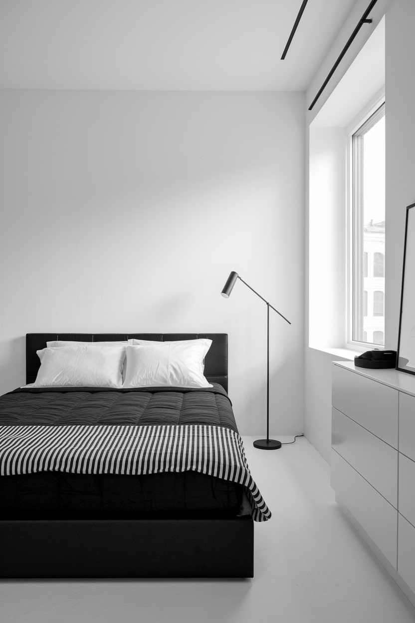 The black and white color scheme is the perfect foundation for a minimalist bedroom design. This style focuses on clean lines, uncluttered surfaces, and functional simplicity. Choose furniture with sleek, simple silhouettes, such as a platform bed and handle-free dressers. Keep decor to a minimum, allowing the strategic use of black and white to make the statement. For this look, a white-dominant room with carefully selected black elements (like a single black floor lamp or a thin black picture frame) often proves most effective.
