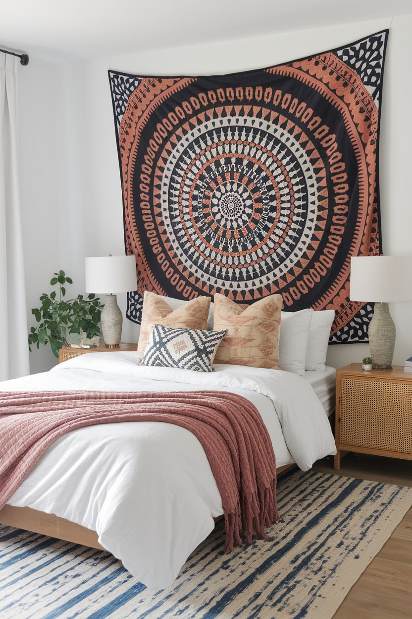 Hanging a tapestry is a simple and high-impact way to establish the boho vibe. Ensure it is wide enough to frame the bed, creating a deliberate and powerful design statement that anchors the room and draws the eye.