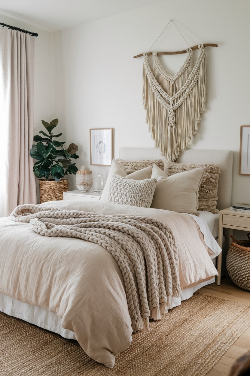 The key to successful textural layering is variety. Don’t be afraid to mix materials that might seem unconventional together. A macramé wall hanging above a smooth wooden headboard or a woven basket next to a sleek ceramic planter adds complexity and interest, making the space feel curated and cozy.