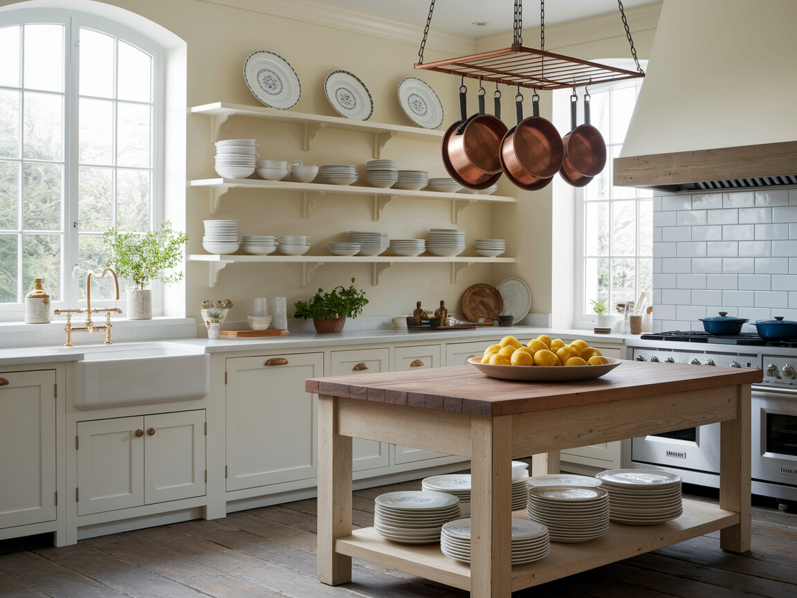 Imagine a large, farmhouse sink made of fireclay. Open shelving displays mismatched white ceramic plates. A large wooden island sits in the center, topped with a bowl of lemons and a copper pot rack hanging above.