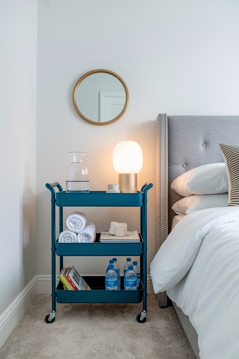 For a modern and flexible alternative to a traditional nightstand, consider a three-tiered rolling utility cart. This item can be styled as a complete mobile welcome station. The top tier can hold a small lamp, a water carafe, and a dish for jewelry. The middle tier is perfect for rolled towels and a few magazines, while the bottom tier can be stocked with snacks and bottled water. Its mobility also allows it to be easily moved to a different part of the room if needed.