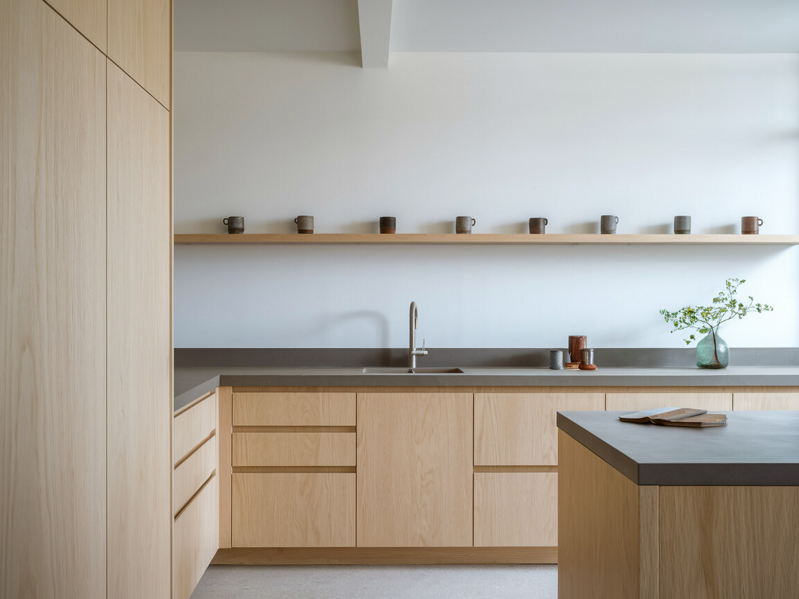 Clean, handle-less cabinetry in a light wood finish. The countertops are a matte stone. On the shelves, a collection of mismatched but tonally similar ceramic mugs adds a touch of wabi-sabi.