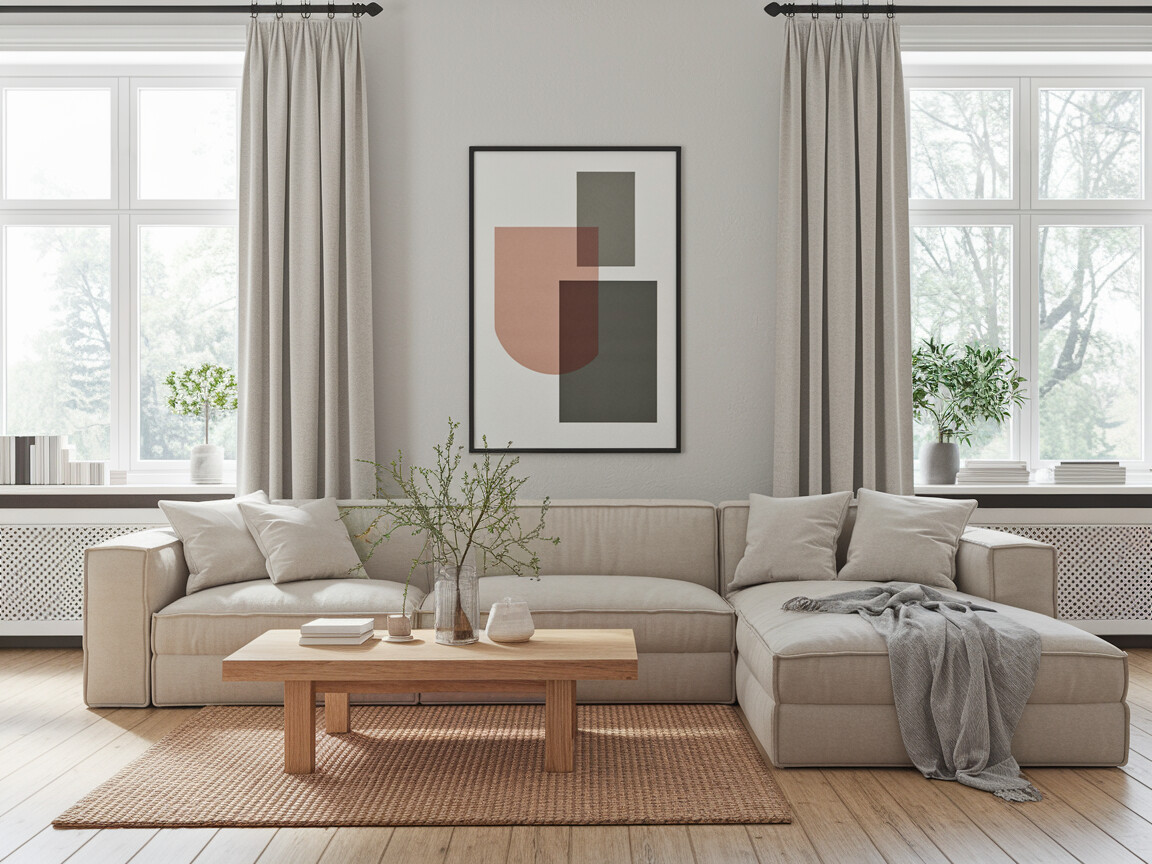How does this look in practice? Imagine a living room with a neutral-toned sectional sofa. Above it hangs a simple, black-framed abstract print. A low-profile oak coffee table sits on a jute rug. Large windows let in the morning sun.