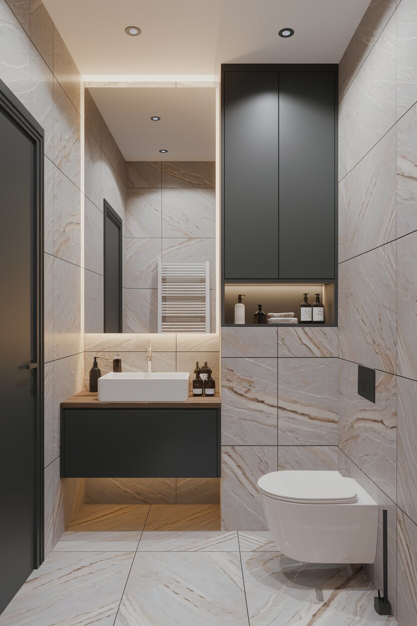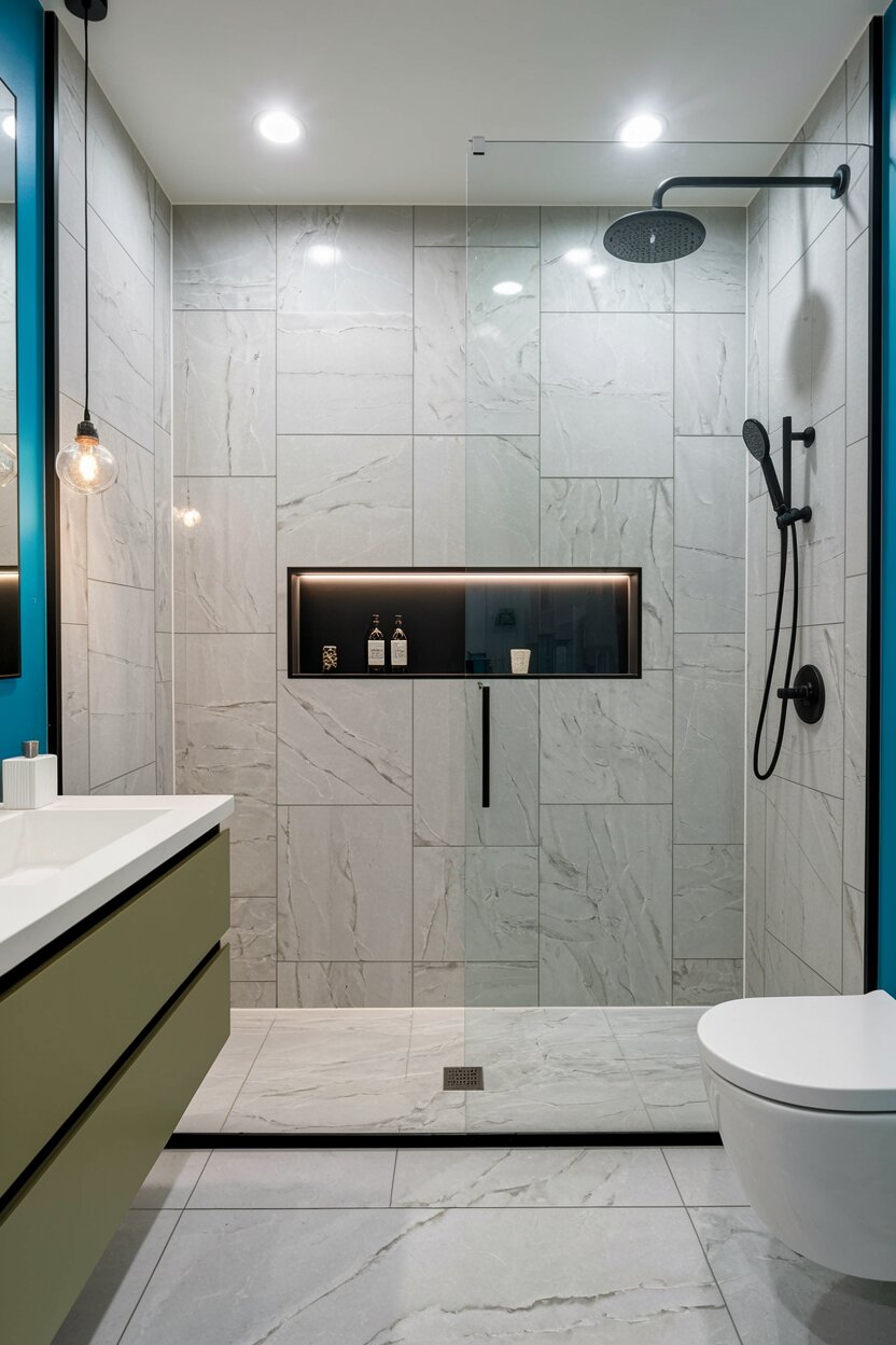This storage idea takes up zero physical space in the small bathroom. These niches are ideal inside the shower for bottles or near the vanity for toothbrushes. They look high-end and are incredibly durable.