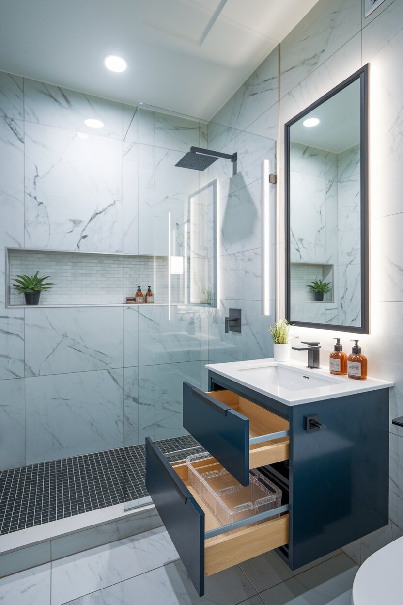 Visual clutter makes a small bathroom feel even smaller. Opaque bins can sometimes look heavy and block light. Clear acrylic drawers and dividers are the professional’s choice for organization.