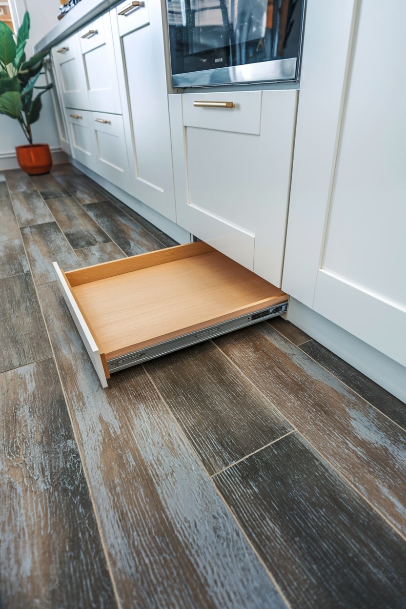 You can install shallow drawers here. They are perfect for flat items like baking sheets, pizza stones, or extra linens. It is the ultimate “secret” small kitchen storage idea. It uses space that literally no other furniture can occupy.