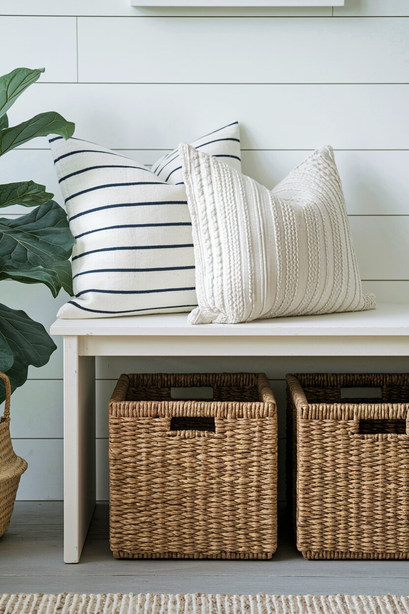 Wicker brings a natural, organic element to your home. Use baskets under a bench to store umbrellas or light spring jackets.