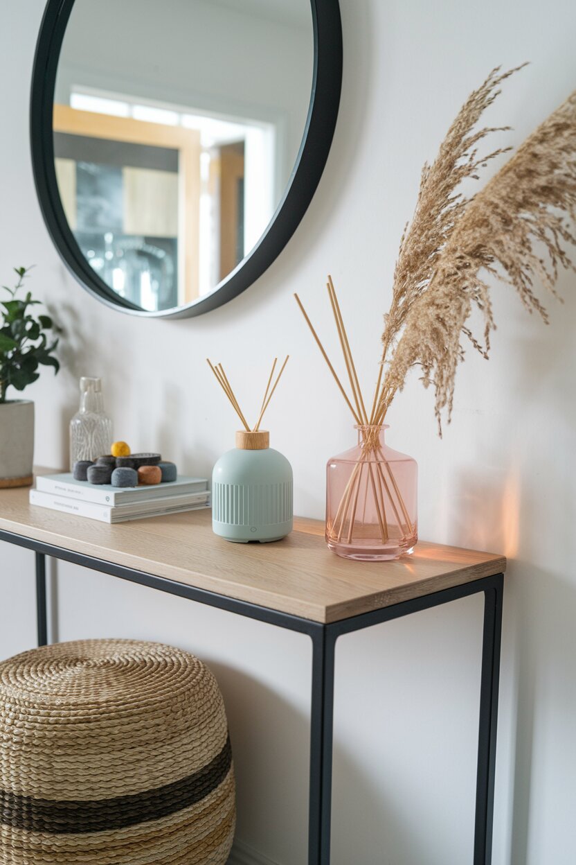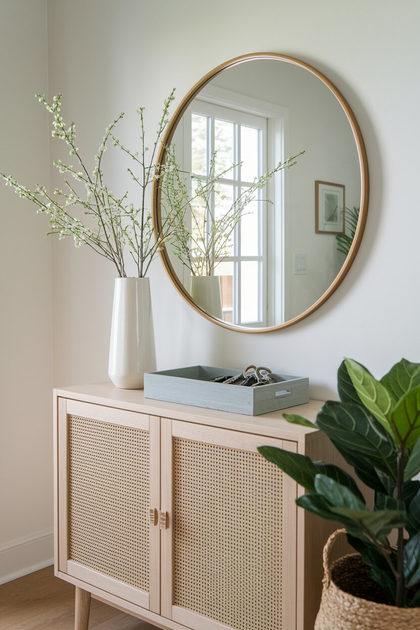Add a few ceramic jars, vases, or a pastel-colored bowl. These small pops of color define your spring entryway decoration theme without overwhelming the senses.