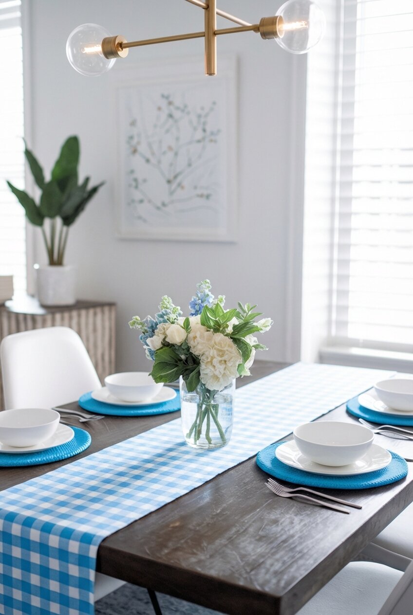 Checkered patterns are making a huge comeback in table decor ideas for spring. A soft blue and white gingham runner feels classic and preppy. It pairs exceptionally well with simple white dinnerware.