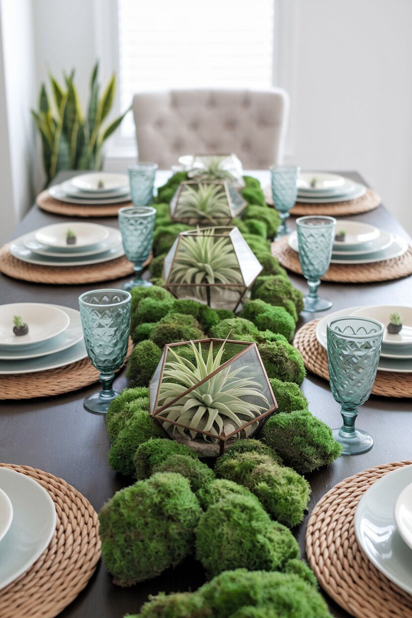 For a modern take on spring table decor, consider a “living” runner. Place clumps of preserved moss down the center of the table. Nestle small glass terrariums or air plants within the greenery. This earthy, woodland aesthetic feels grounded and fresh.