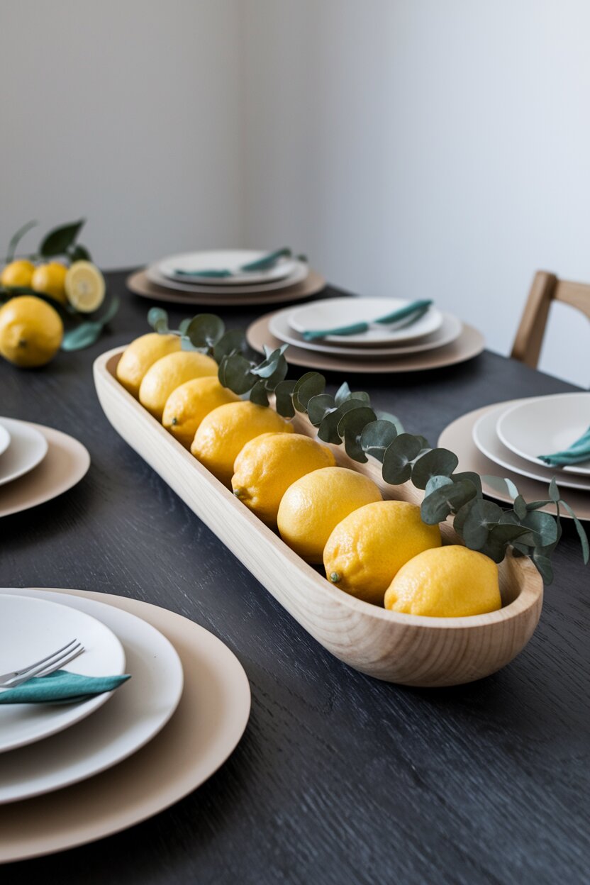 Nothing says “bright” quite like lemons and limes. Fill a long wooden dough bowl with whole citrus fruits. Add a few sprigs of eucalyptus for contrast. This is a cost-effective way to achieve vibrant spring table decoration without needing a professional florist.