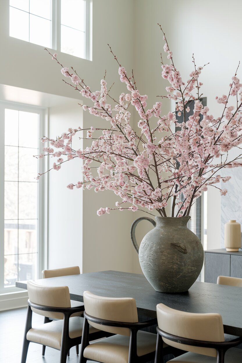 If your dining room has high ceilings, go big. Find a few large flowering branches, like cherry blossoms or forsythia. Place them in a heavy ceramic pitcher or vase. The height creates a dramatic visual impact that defines the entire room.