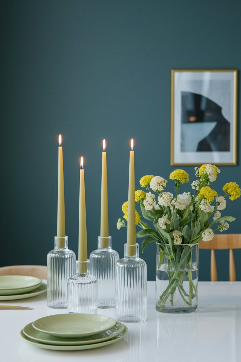 Candlelight isn’t just for winter. Switch out heavy brass holders for clear glass ones. Use taper candles in shades of peach, sage, or pale yellow. They provide a warm glow for evening spring dinners.
