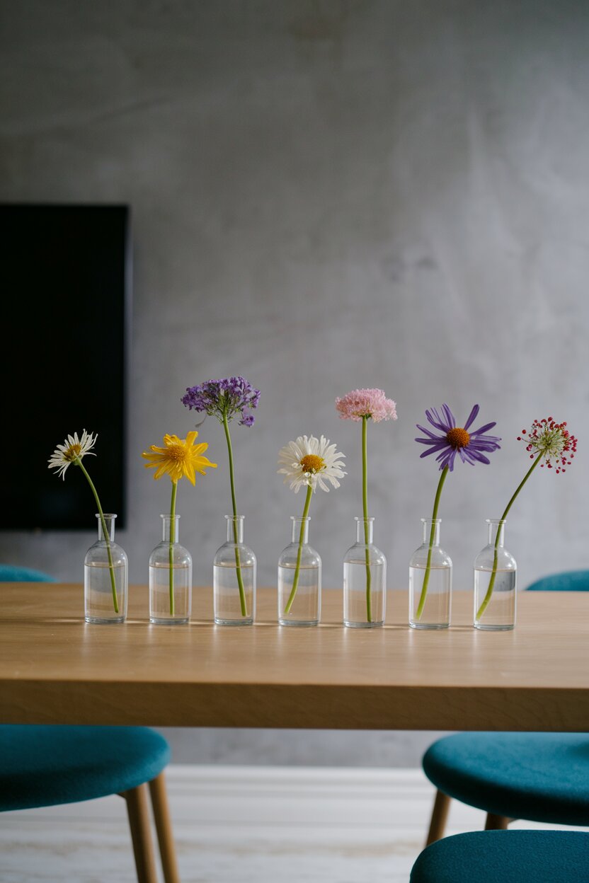 Sometimes, less is more. Line the center of your table with five to seven identical bud vases. Place a single stem of a different wildflower in each one. This linear arrangement is perfect for narrow tables where space is a premium.