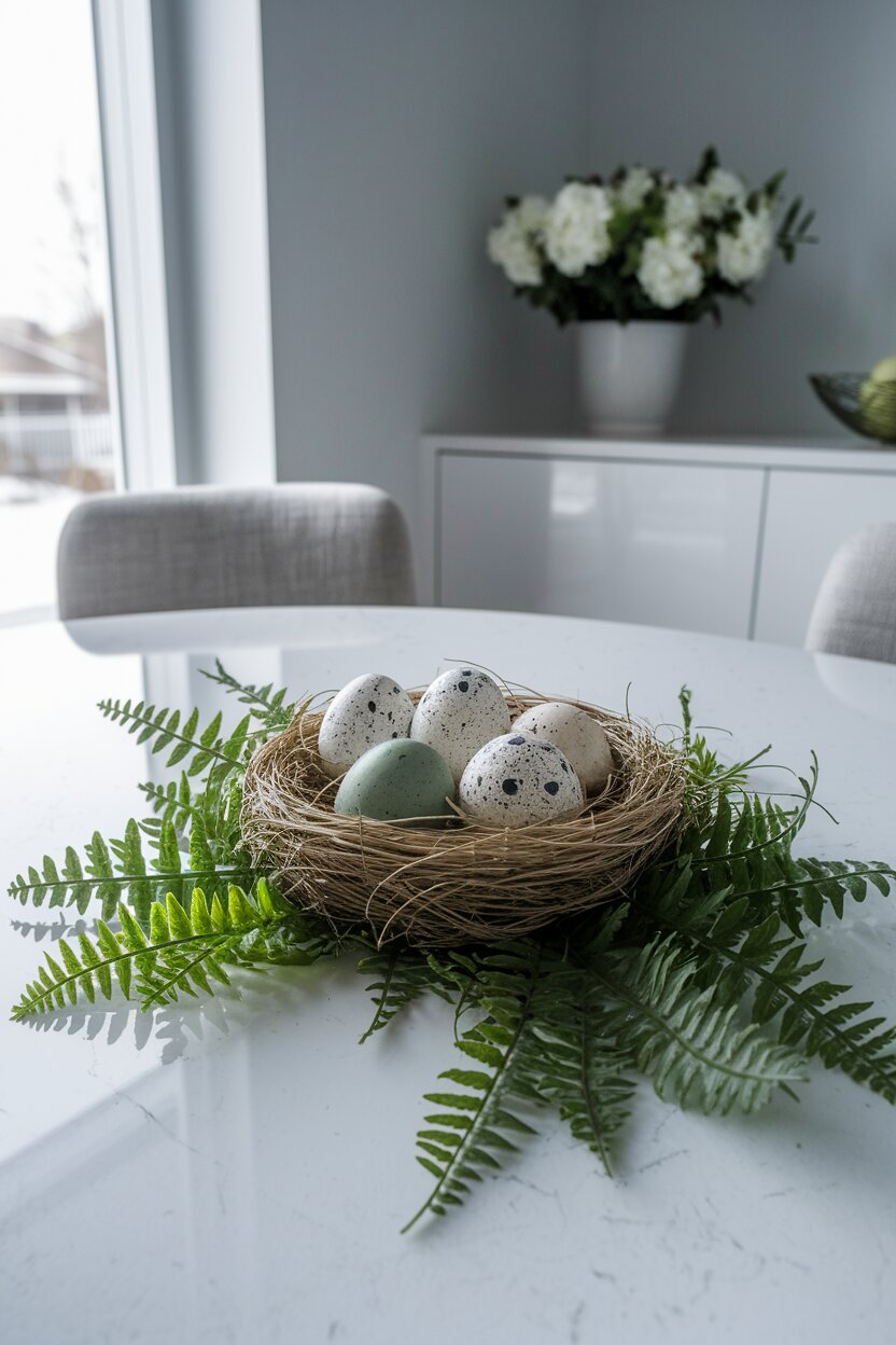 Spring and Easter themes often overlap. Use a small decorative nest filled with speckled ceramic eggs as a focal point. Surround it with soft greenery like ferns to keep it looking sophisticated rather than kitschy.